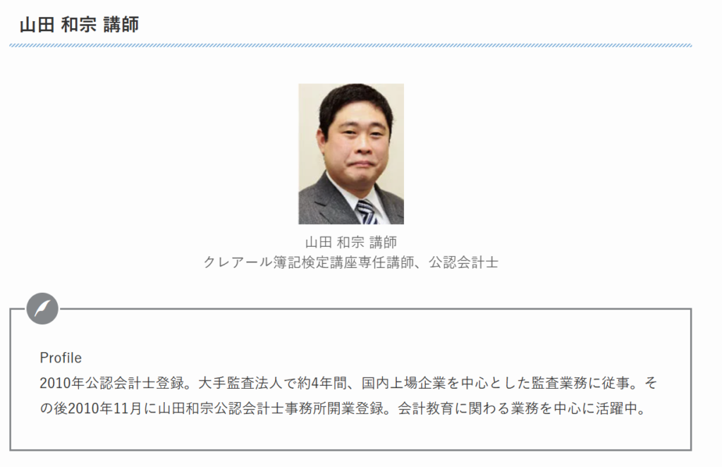 私は日商簿記3級2級をクレアールで学びましたが、山田先生の授業はとても分かりやすかったです。