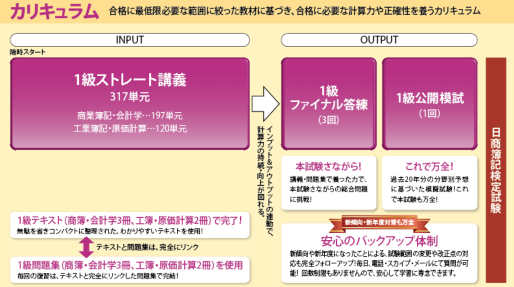 | オプション講義 | 2級復習講義、基礎養成講座、電卓講義、収益認識基準対策セミナー、理論対策講義、全経上級対策講義 | オンデマンド講義 オリジナルレジュメ |