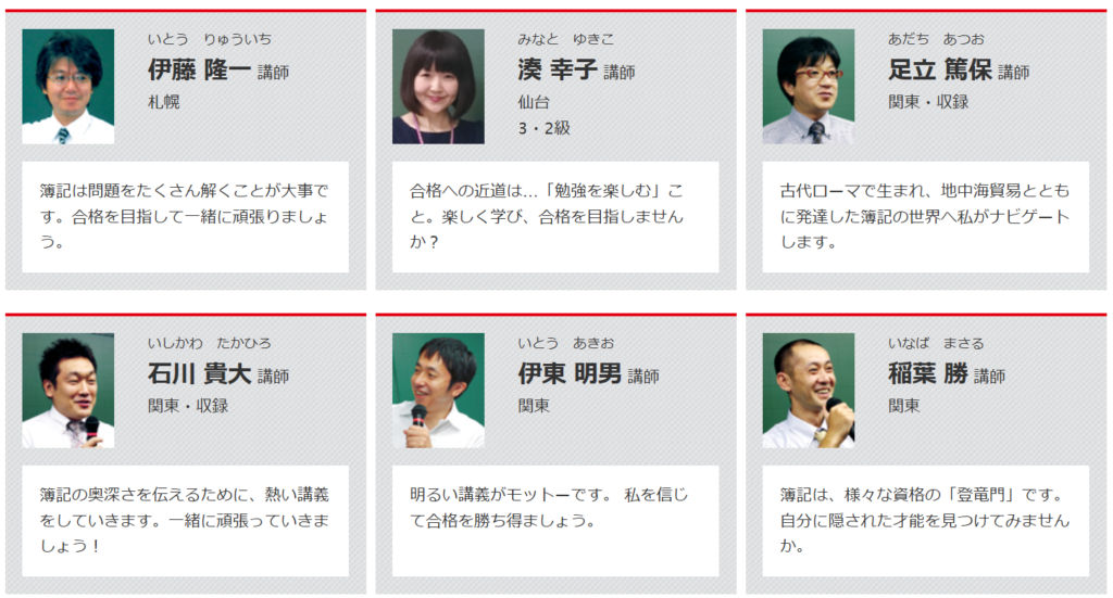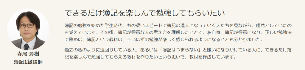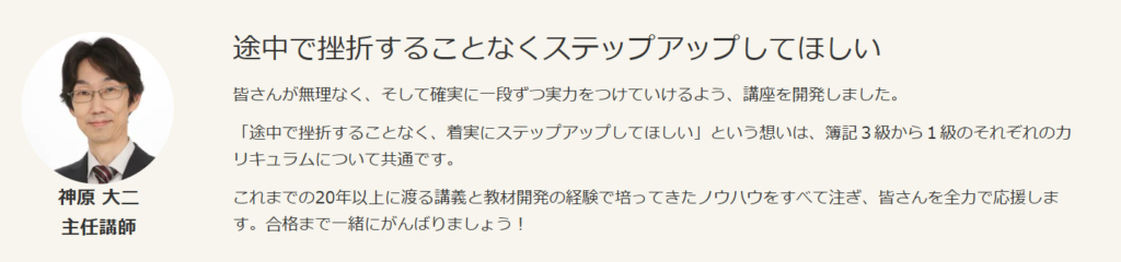 また、自らが受験生だったときの経験と、経営者としての視点から、合格に直結するだけでなく、合格後にも役に立つ講義に定評がある。引用元:プロ簿記講座