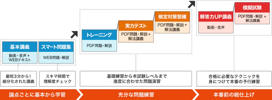 過去問題を使用し出題論点別に効率の良い問題の解き方など、解法テクニックを学習し、最後に中間模試、直前答練、とおる模試などの本試験と同レベルの問題演習行っていきます。