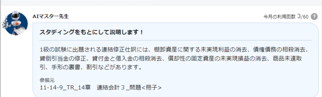 | スタディング | 通常価格66,600円(テキストなし) | 約80時間 商業簿記/会計学 95回 工業簿記/原価計算 73回 電卓の使い方講義1回 | 検定対策答練:3回 模擬試験:1回 | 10回まで(1枚1100円で購入可能) 質問AI | 3級~1級の年間合格者数1,000名以上※簿記1級だけのデータはありません。 |