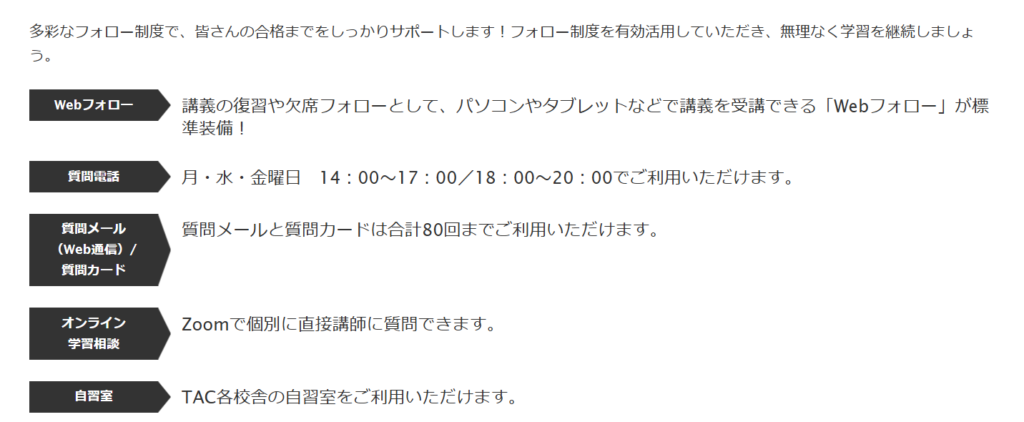 | TAC | 165,000円 | 1回2時間45分 69回 (約190時間) | 答練:5回 公開模試:1回 | 80回まで無料 | ー |