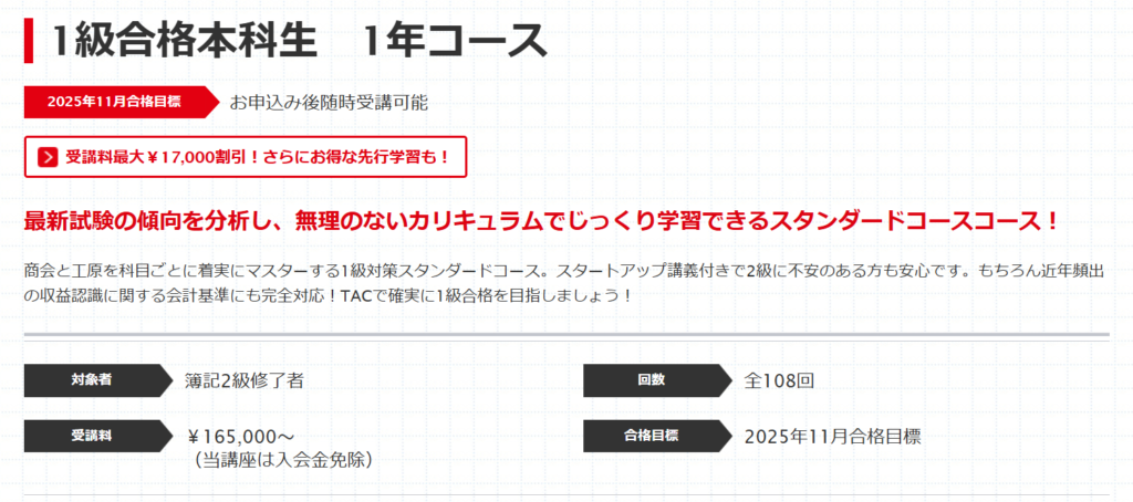 | 税込価格 118,000円(テキスト6冊付き) 108,000円(テキストなし) | 2024年6月下旬開講 2024年11月または2025年6月合格目標 | 上記すべてのカリキュラムを含んでいます。(ライブ講義・オンデマンド視聴・学習相談・質問対応・すべての資料のダウンロード) | 日商簿記2級合格者 |