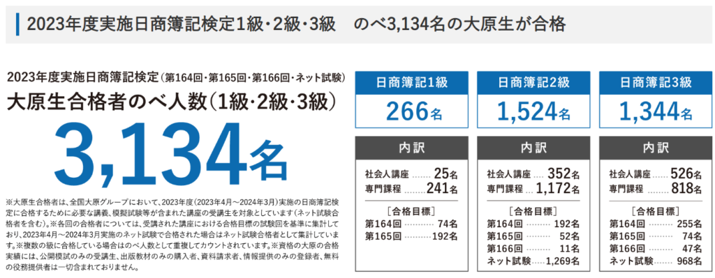 | 大原 | 146,500円 | 全52回(約156時間) | 直前模擬試:12回 公開模試:1回 | 無制限 メール・電話・オンライン質問 | 2023年の簿記1級合格者数は266名 ※3級~1級の年間合格者数3,134名 |
