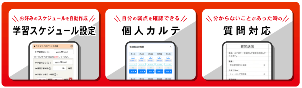 | クレアール | 132,000円 | 317単元 (約160時間) | ファイナル答練:3回 公開模試:1回 | 無制限 | ー |