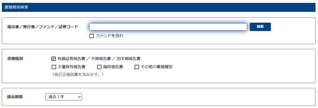 「書類簡易検索」から企業名を入力し、「書類種別」で「有価証券報告書」にチェックを入れ、「提出期間」を入力し、検索するだけで閲覧できます。